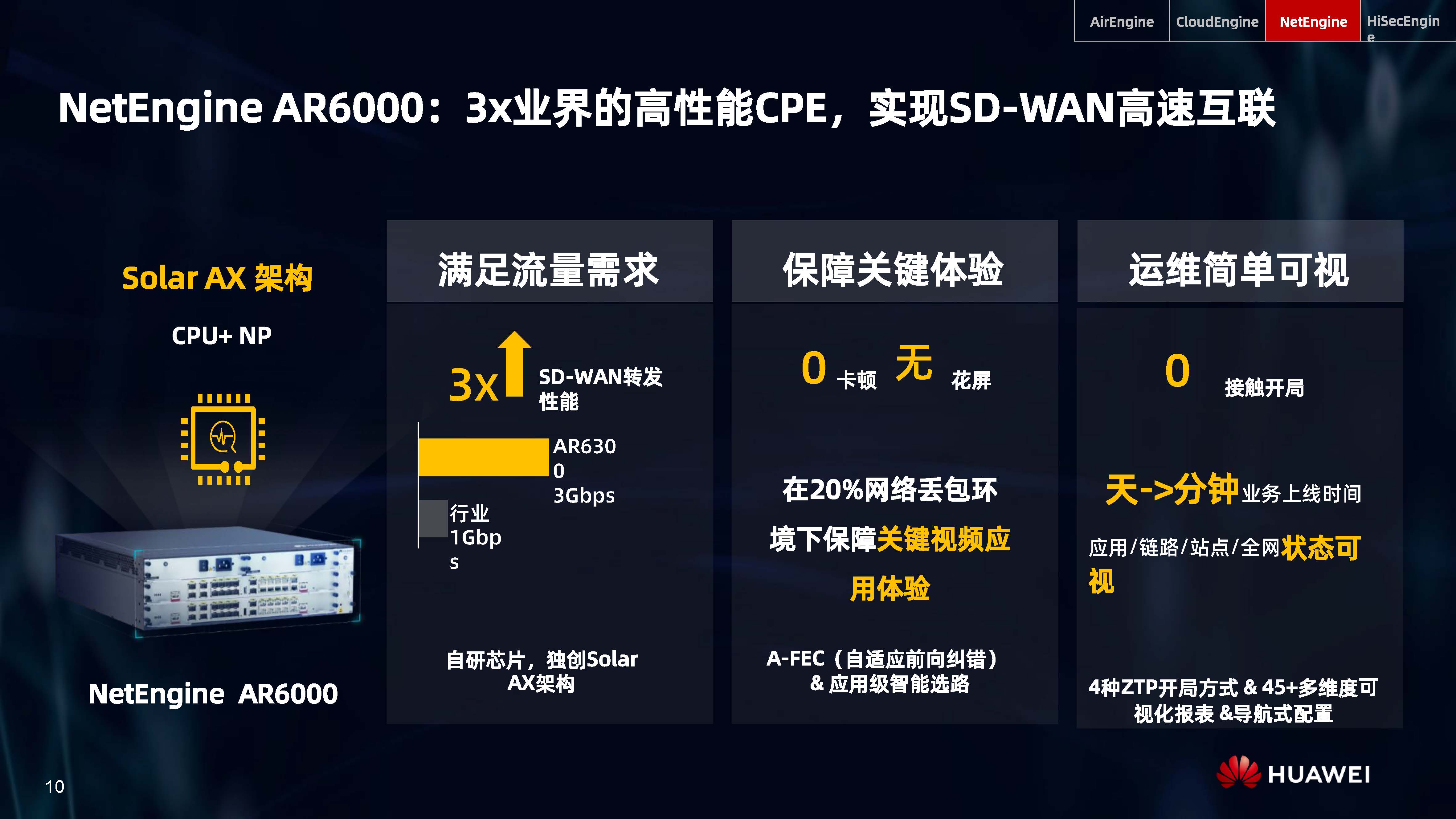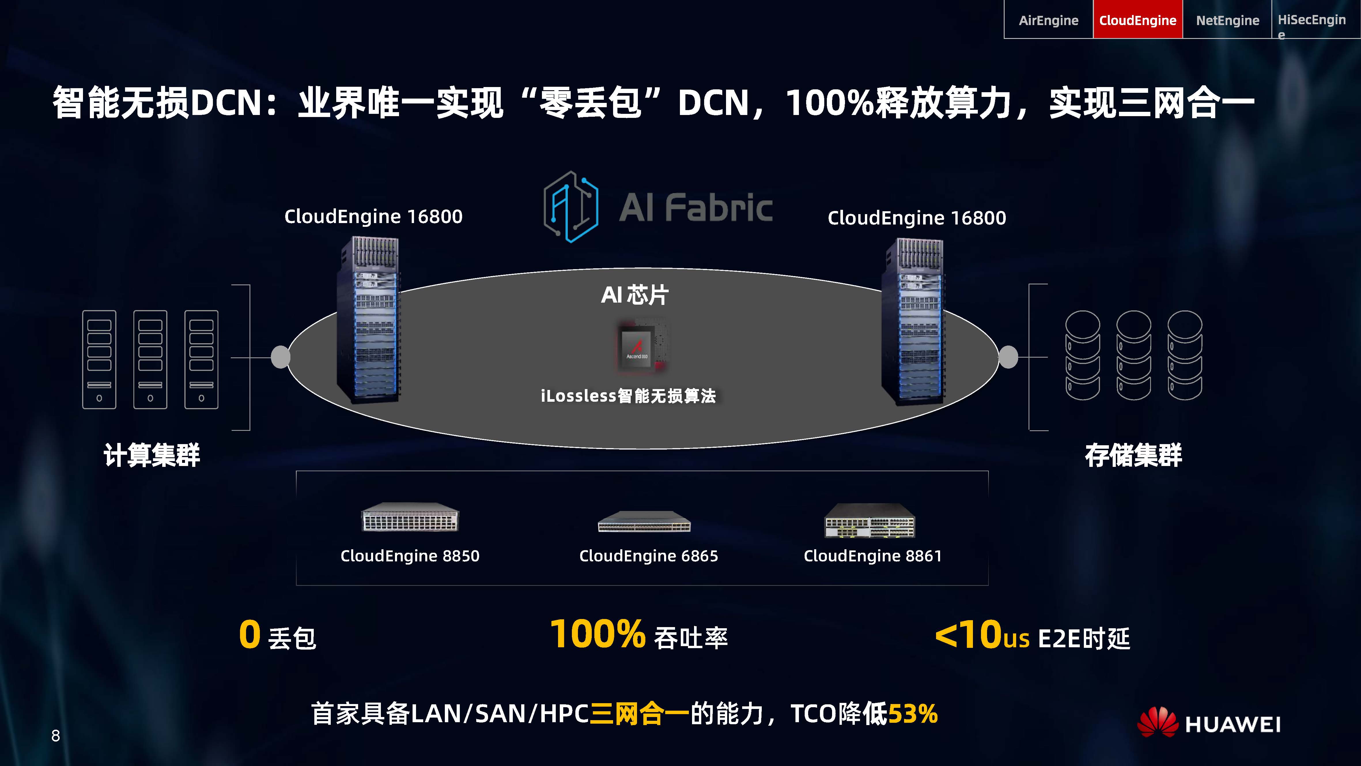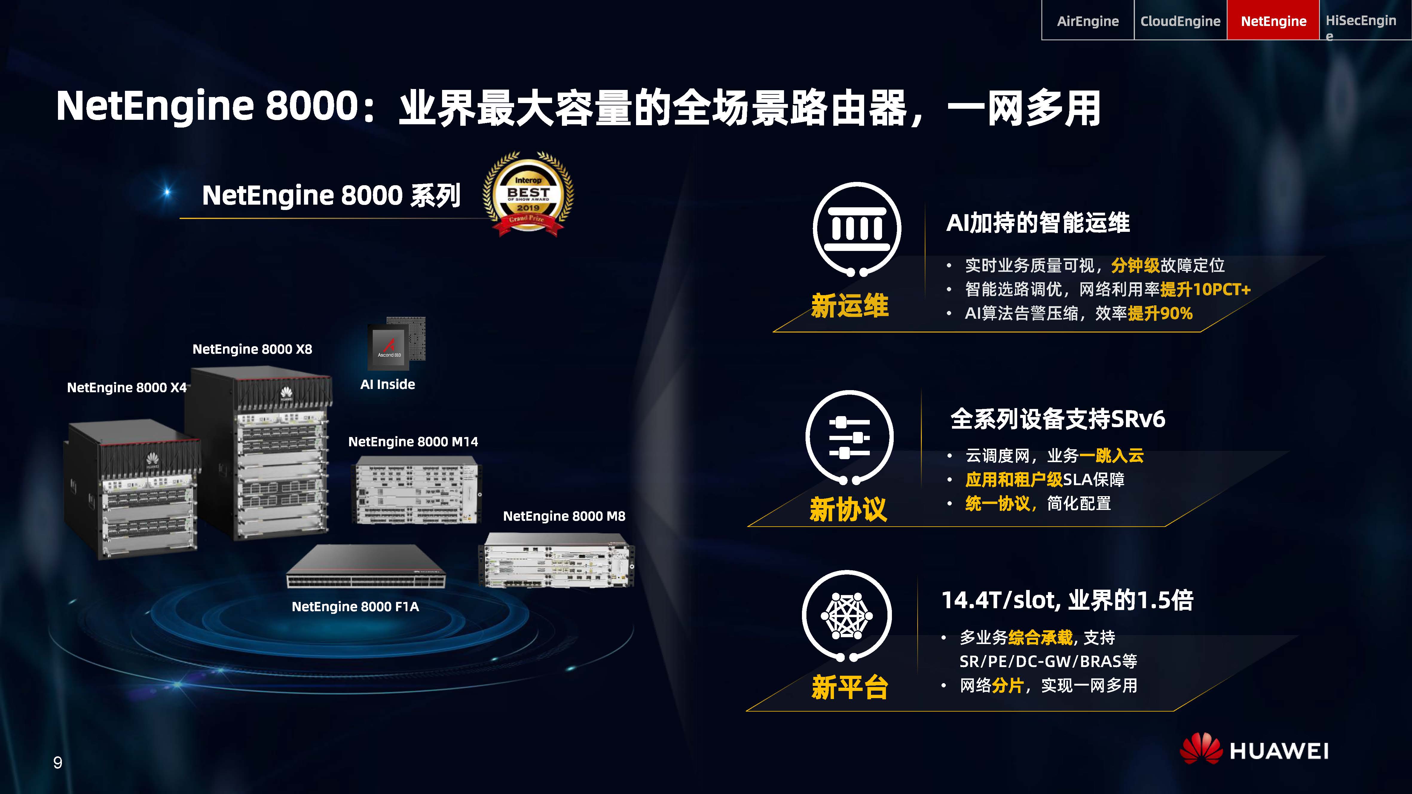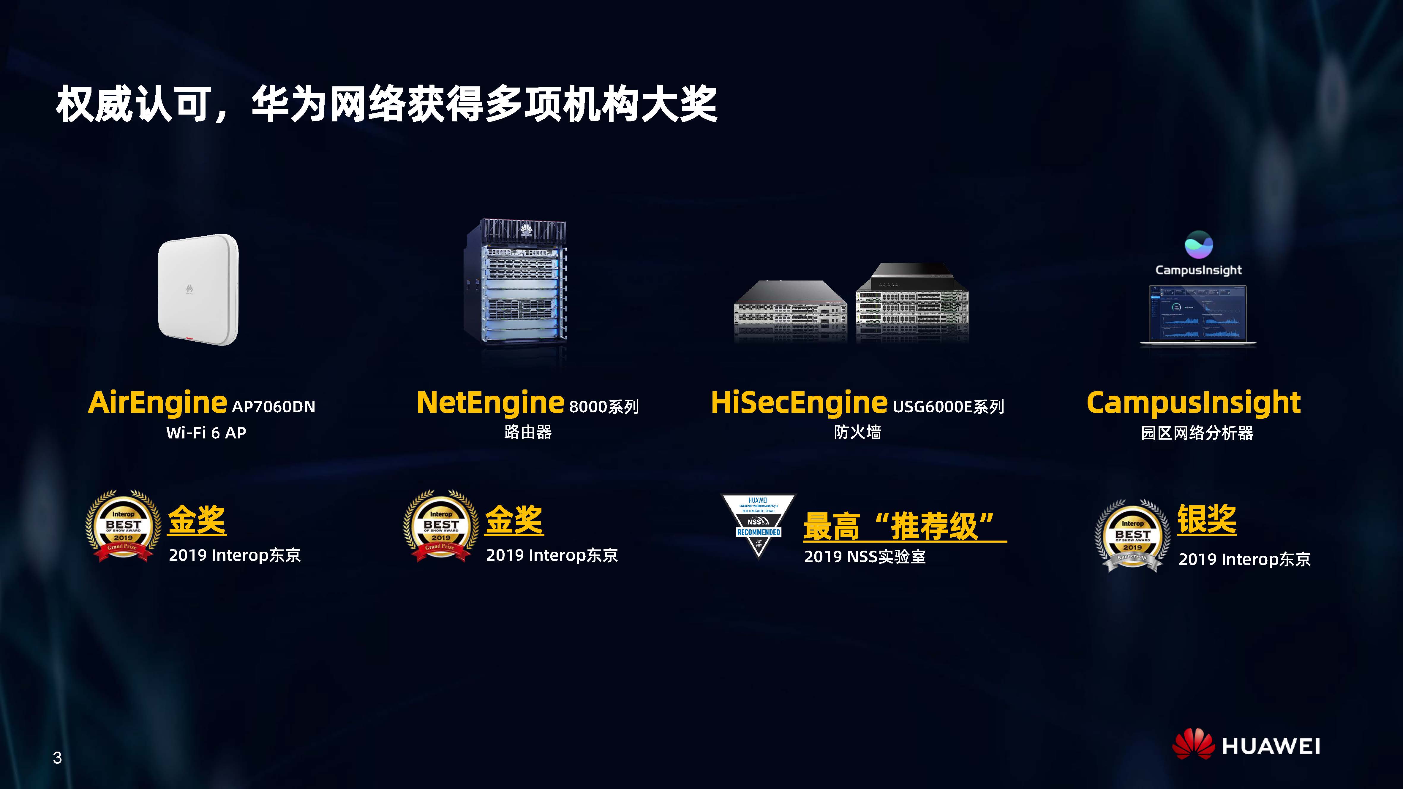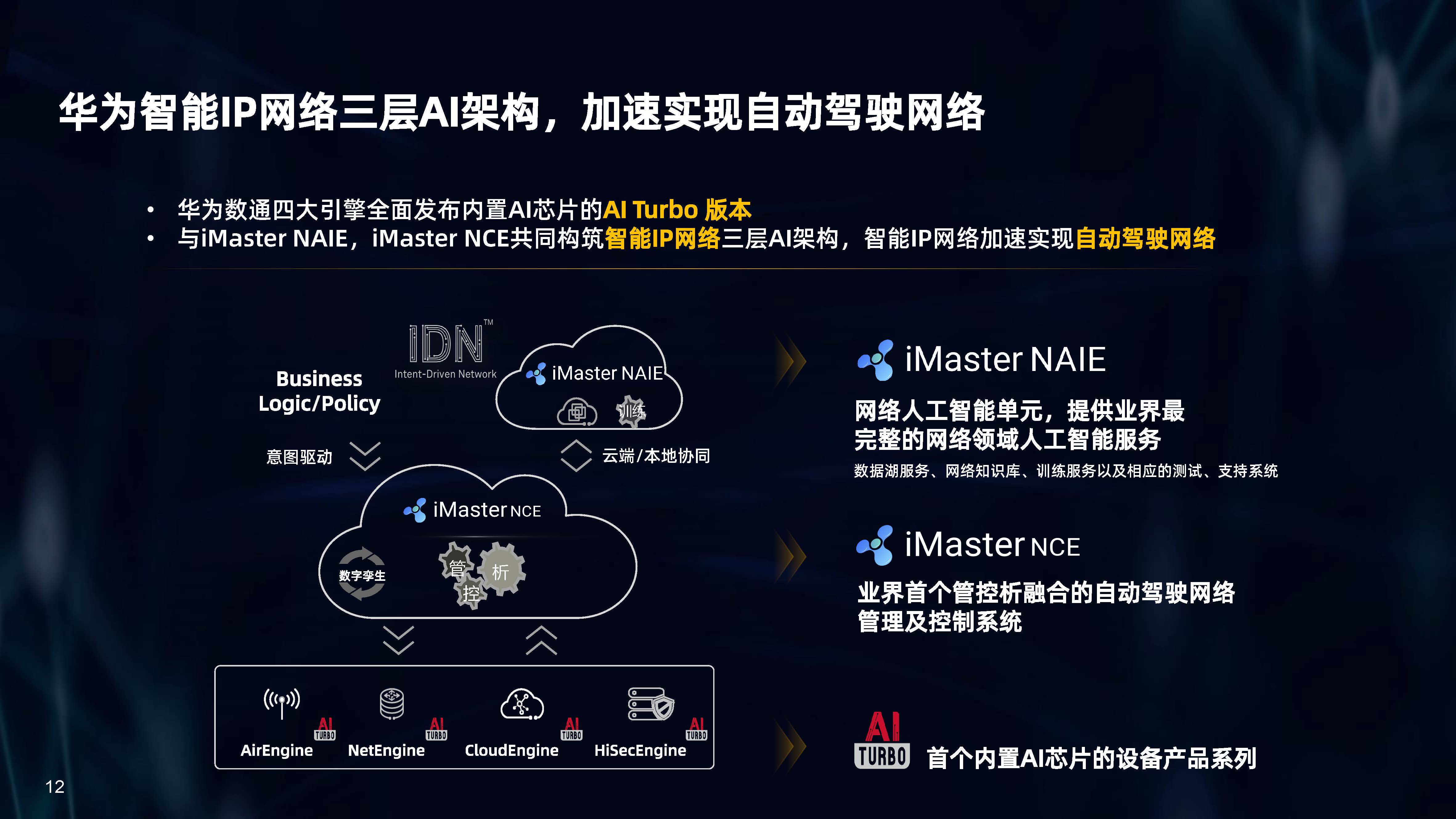 設(shè)備層AI,是內(nèi)置人工智能芯片的AI Turbo設(shè)備系列,涵蓋了AirEngine Wi-Fi 6、CloudEngine交換機(jī)、NetEngine路由器、HiSecEngine安全網(wǎng)關(guān)等四大品類;網(wǎng)絡(luò)層AI,是iMaster NCE自動駕駛網(wǎng)絡(luò)管理與控制系統(tǒng);云端AI,是業(yè)界首個網(wǎng)絡(luò)人工智能平臺iMaster NAIE。三層AI架構(gòu)全面提升IP網(wǎng)絡(luò)智能化水平,引領(lǐng)智能IP網(wǎng)絡(luò)新時代。
